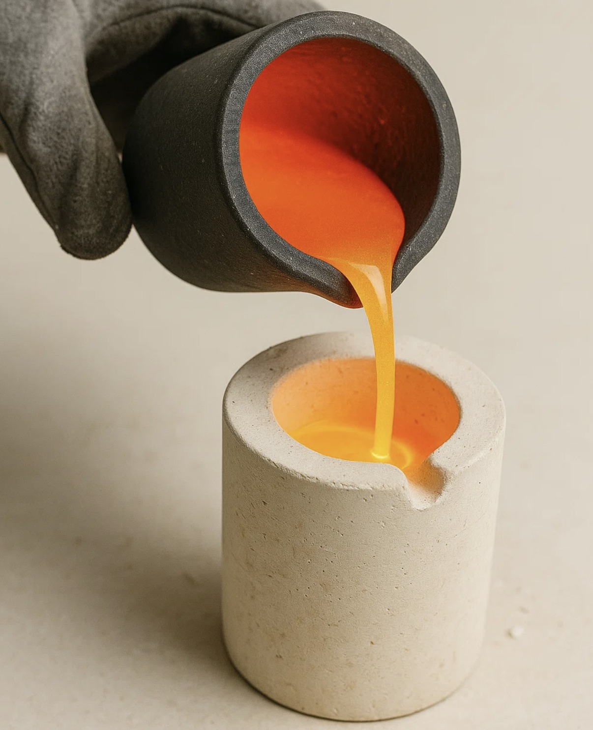 石こう型に溶けた金属を流し込む方法。JUNGOLDの純金商品はこちらの製法です。