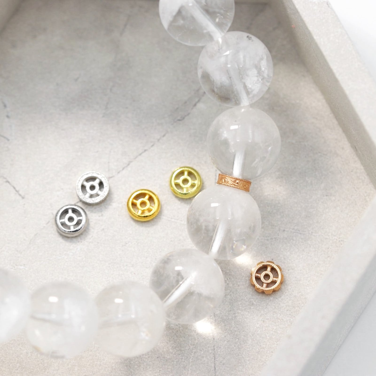 多くのブレスレット用パーツは、メッキや真鍮などの手軽な素材。
