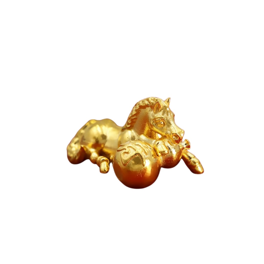 黄金に輝く“純金の「瓢箪(ひょうたん)を抱える馬」”。