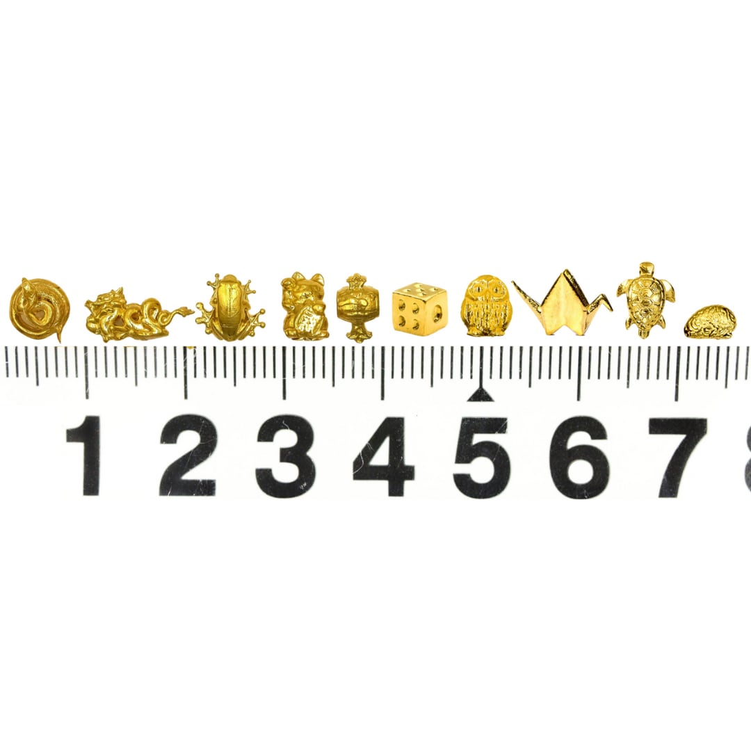 左から、フクロウ、カエル、亀、招き猫、ヘビ、龍、こづち、サイコロ、折り鶴、脳みそ