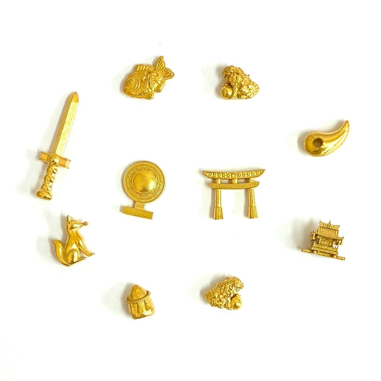 天照大御神セット(鏡・剣・勾玉の三種の神器)をはじめ、岩、鳥居、狐、狛犬、お御輿、そして新作のたい焼きなど、神棚やお守りにふさわしいモチーフを揃えました。