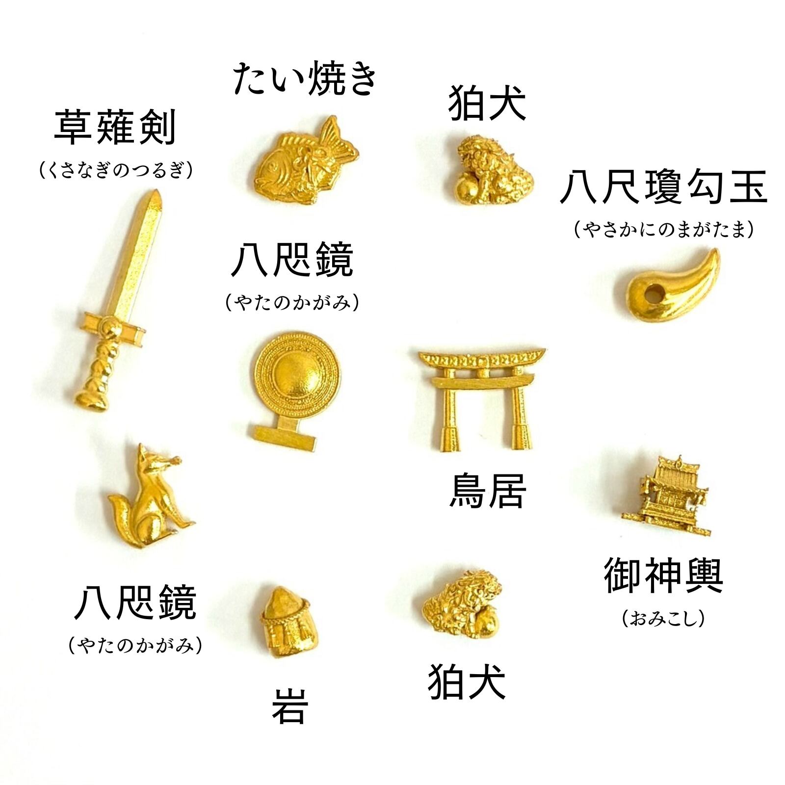 天照大御神セット(鏡・剣・勾玉の三種の神器)をはじめ、岩、鳥居、狐、狛犬、お御輿、そして新作のたい焼きなど、神棚やお守りにふさわしいモチーフを揃えました。