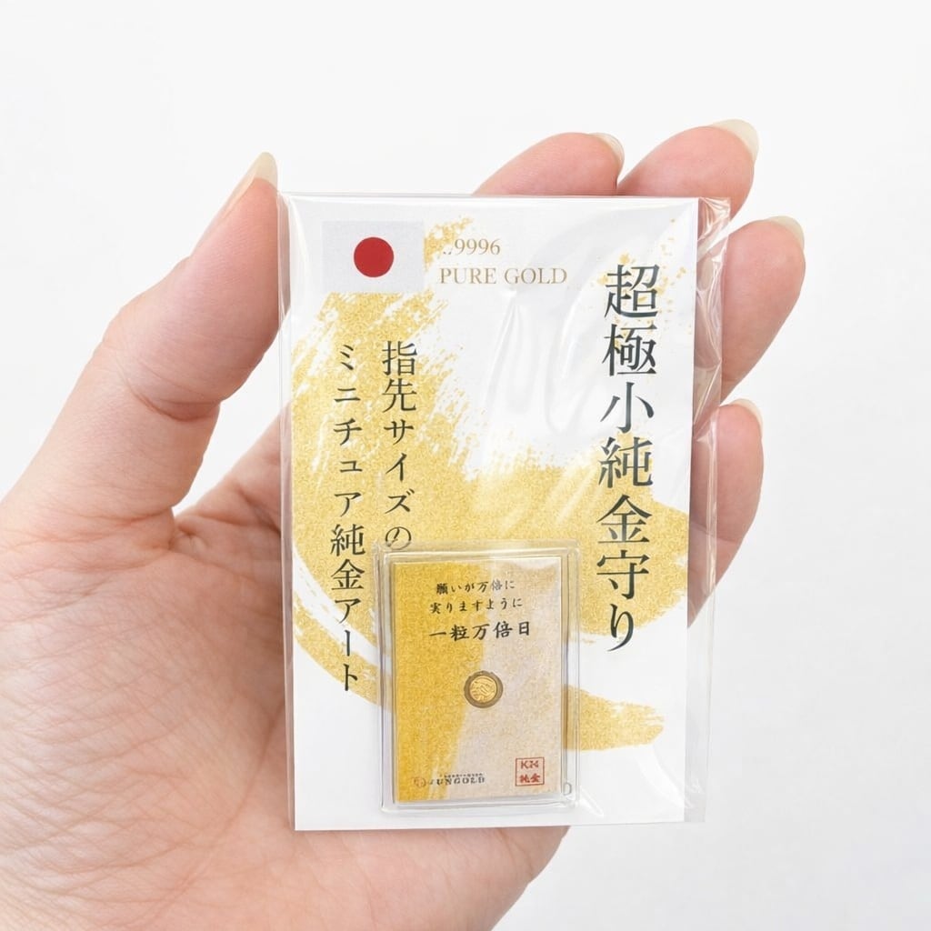 「一粒万倍日」をイメージした、純金の御守りを作りました。本物の無垢の純金製です。